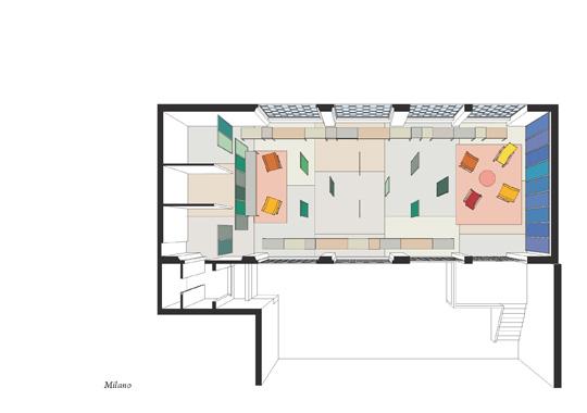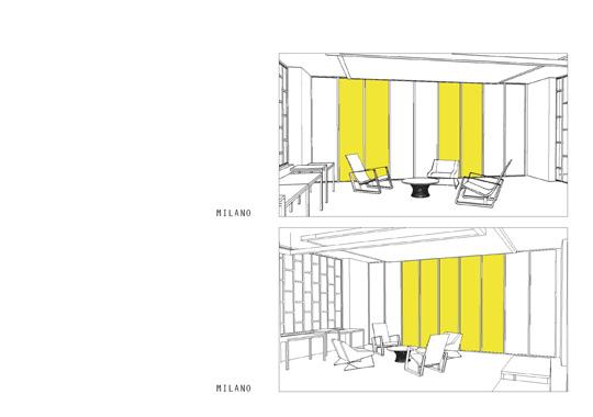 The first level intend to invest part of the budget for the material realization of the project described above. No major changes are proposed for the exhisting space in an adaptive re-use perspective. Floors, walls, ceilings, stair and mezzanine structure are maintained as they are. Spatial layout is organized by juxtaposition of few, clear, simple elements able to generate special spaces. The wall, together with the new stair,a big piece of forniture made on a modular basis, finished just on one side, is the main intervention. Furnishing is partly built in (as the bench on the mezzanine floor) and part reduced to essential elements (like in the cash lounge). For the ceiling of the area under the mezzanine and the flooring of the mezzanine we imagine to use the 'bollo' linoleum, a very simple, economic and iconic milanese material. The lighting will be enhanced adding the two big light box wall mounted. We aestimate to invest in these installation the 60% of the budget.
